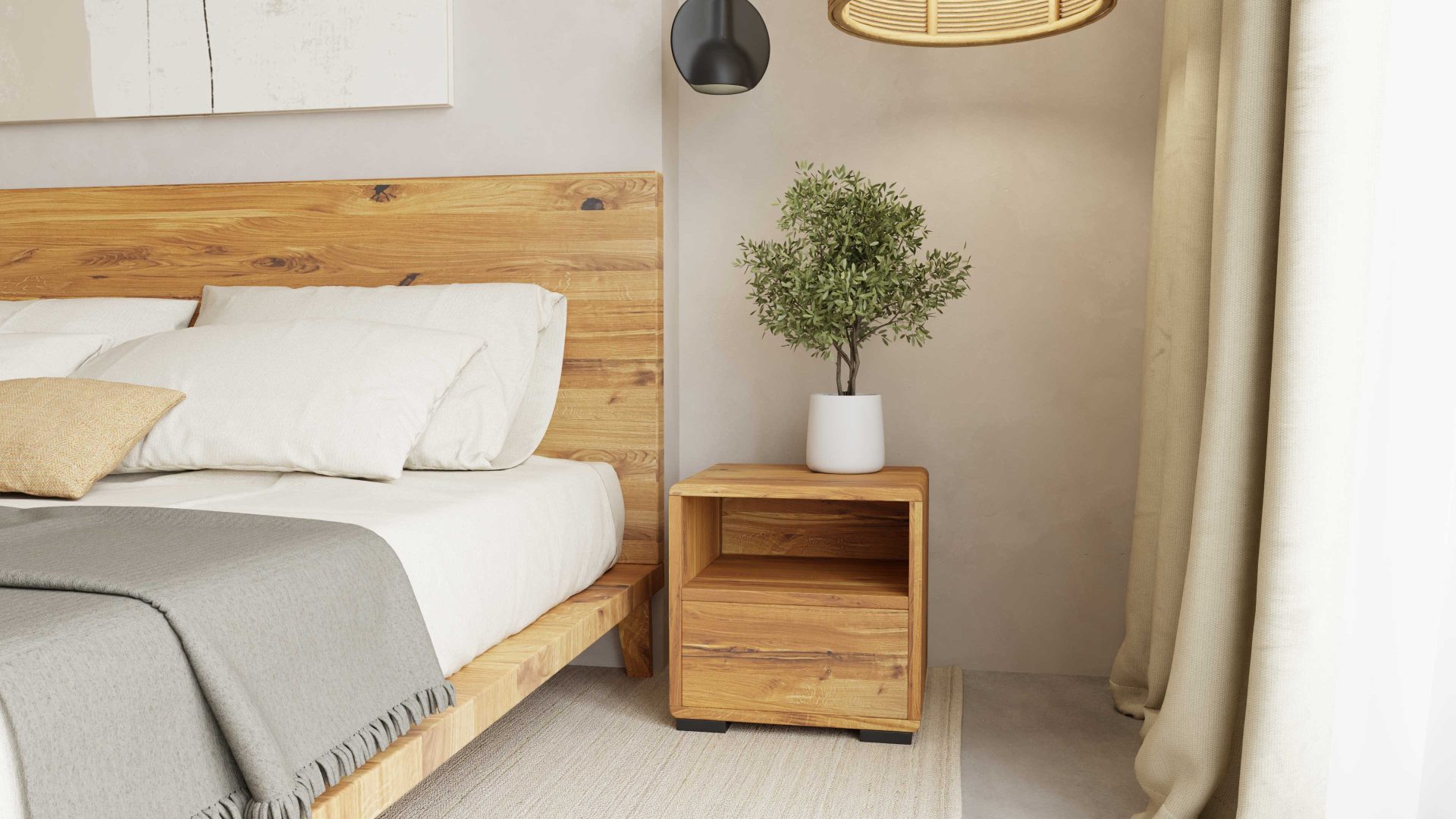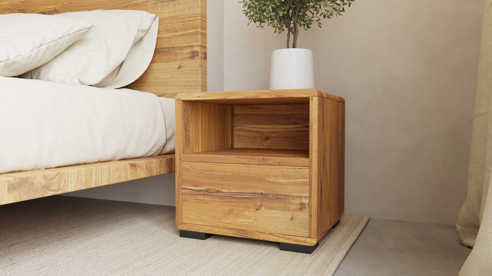 Szafka nocna wykonana w naszym wydaniu z litego drewna dębowego wpasuje się w każdy wystrój sypialni.