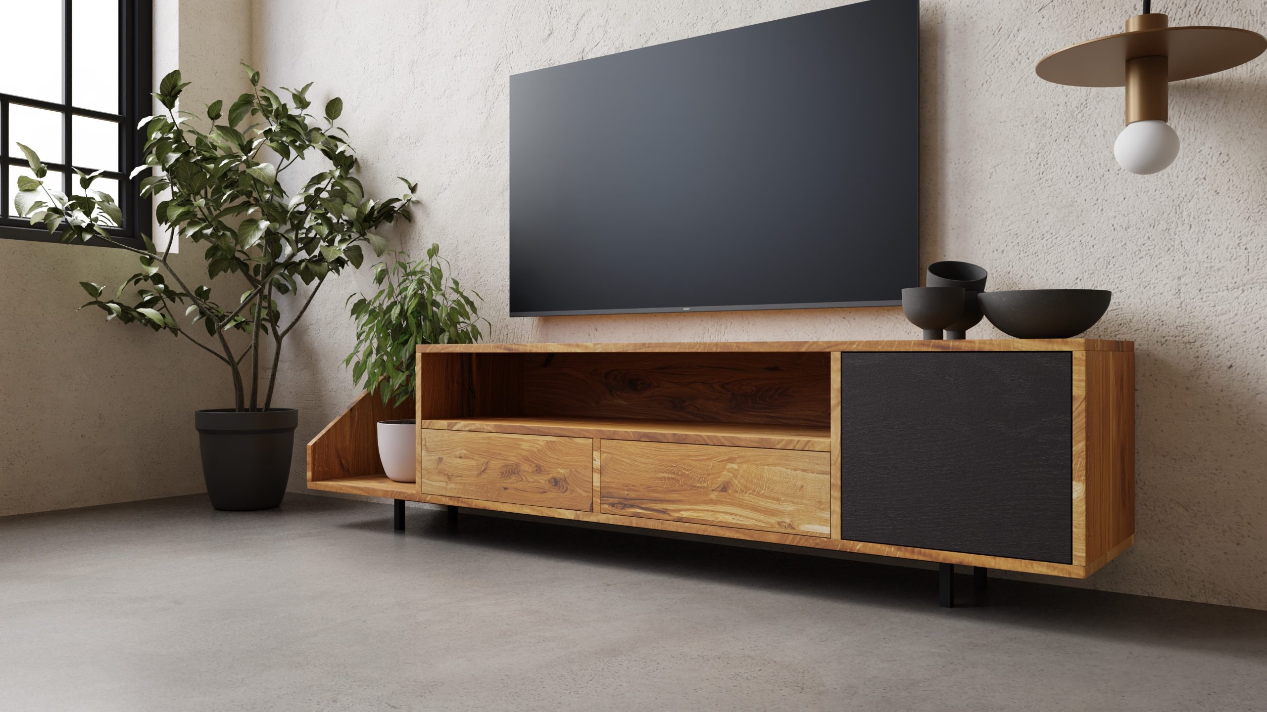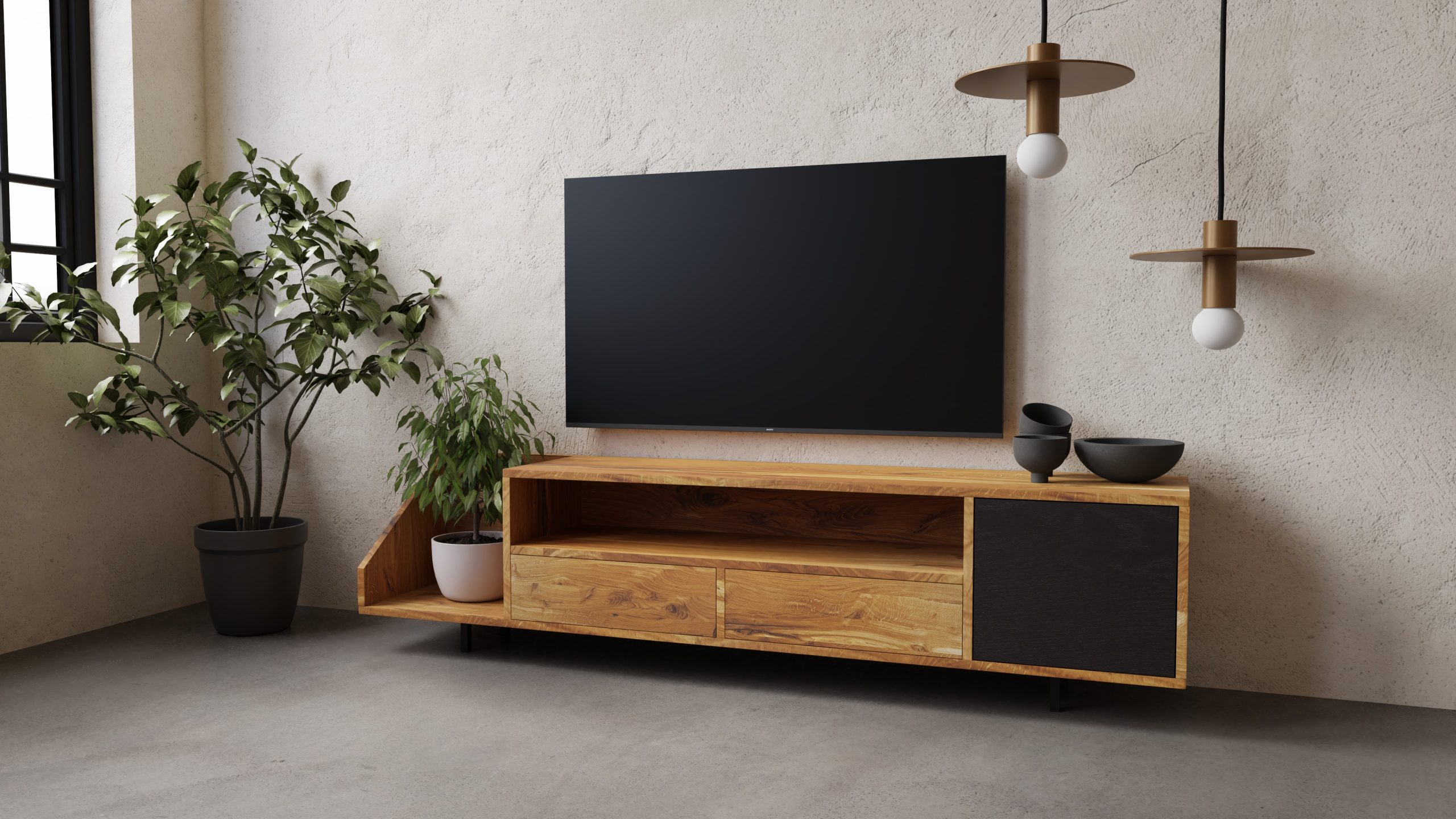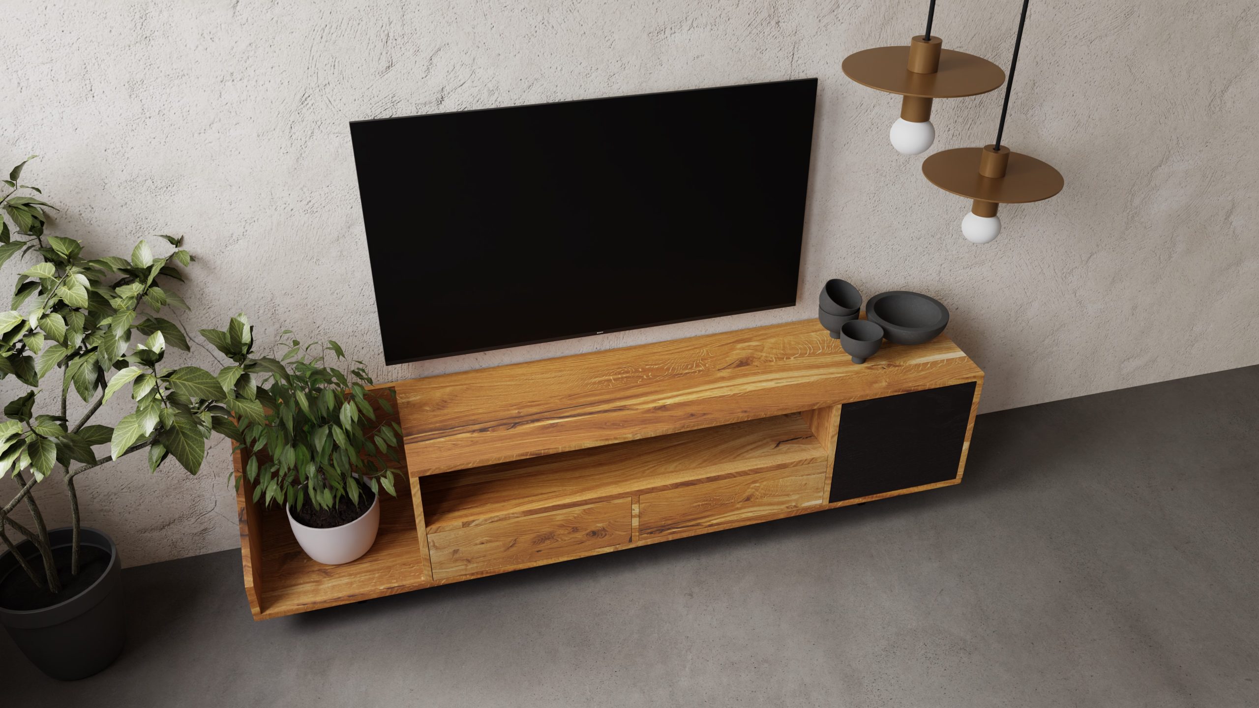 Ponadczasowe piękno drewna dębowego z którego została wykonana nasza szafka RTV oraz stabilnej, delikatnej stalowej konstrukcji to pewna propozycja dla nowoczesnych salonów.